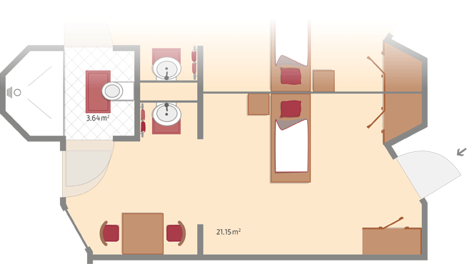 Alle Zimmer verfügen über einen direkten Nasszellenzugang mit Toilette und behindertengerechter Dusche. Je nach Lage der Zimmer unterscheiden sich diese in Größe und Schnitt.